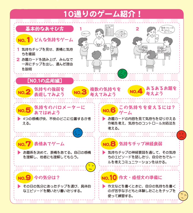 5種類の表情チップ(気持ちチップ)と家庭編、園・学校編の合計80種類の「お題カード」などを使って、自己・他者のさまざまな感情を10のゲームを通して体験し、理解していきます。