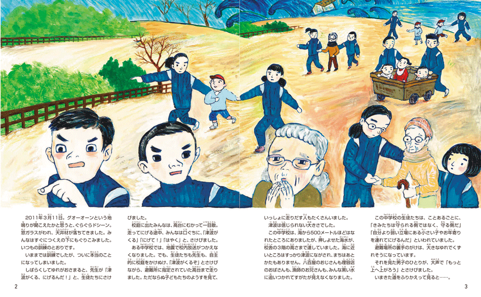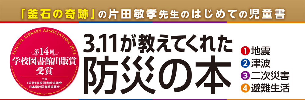 それらの図書を作成する過程で、今回の図書の監修をしてくださった片田敏孝先生を知ることになったのである。というよりも、それらの図書に全力をあげていたからこそ、先生との出逢いがあったということかもしれない。先生が津波防災教育に取り組んだ岩手県釜石市で、あの日に登校していた子ども全員が助かったという事実、その成果を生みだした「避難の3原則」は、3.11関連の図書を次々と出版していた小社にとって、将来にわたって残しておくべき事柄だと考えられた。こうして学校図書館向けの図書にするならこれしかないと判断したのである。
