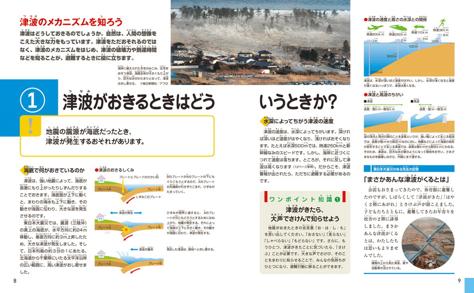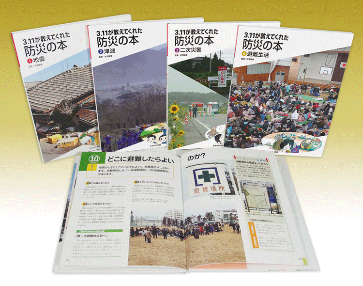 それらの図書を作成する過程で、今回の図書の監修をしてくださった片田敏孝先生を知ることになったのである。というよりも、それらの図書に全力をあげていたからこそ、先生との出逢いがあったということかもしれない。先生が津波防災教育に取り組んだ岩手県釜石市で、あの日に登校していた子ども全員が助かったという事実、その成果を生みだした「避難の3原則」は、3.11関連の図書を次々と出版していた小社にとって、将来にわたって残しておくべき事柄だと考えられた。こうして学校図書館向けの図書にするならこれしかないと判断したのである。