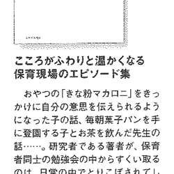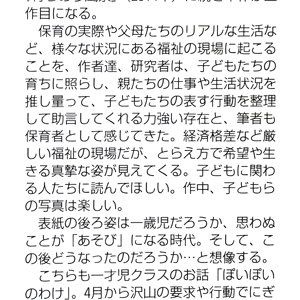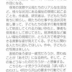 保育の現場、そして子育ての現場で起きるさまざまな問題について、けっして上からものを見ず、言わず、寄り添いながらともに考えていく著者の姿勢に、保育士さんはもちろん、お母さんお父さんの心もほぐされて、明日からの勇気が湧くと思います。