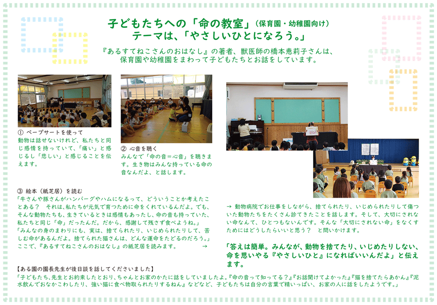 猫もあなたと同じ、悲しい、寂しいと感じる、お腹も空く。子どもたちがそれを知るだけできっと世の中は変わります。