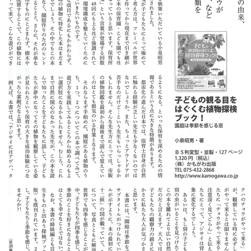 身近な自然と子どもが触れあうときの接し方や、自園の園庭の植物を知らない人が多いと感じます。著者は、植物を身近に感じてもらうきっかけづくりとして、園庭で植えて欲しい植物など含め約120種類を紹介します。