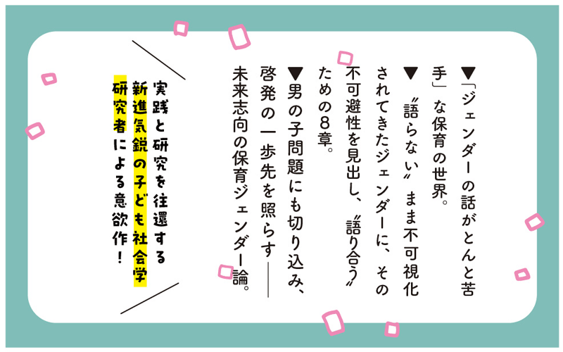 ◎保育とジェンダーを架橋する、注目の若手研究者による初の単著!ー現場の保育者、保育を学ぶ学生、子どものジェンダーに関心のあるみなさんに向けて。