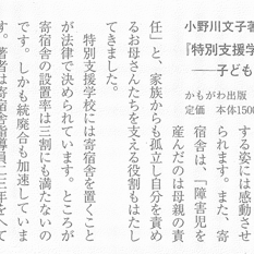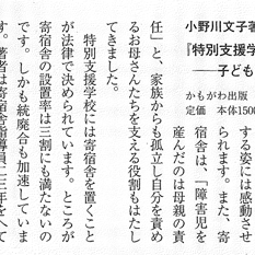 ご自身が寄宿舎指導員という実践現場で、子どもと家族を支えてきた小野川さんの筆には、強さと温かさがこもっています。また、ご家族に障害者がいらしたことを明かす「はじめに」は、本書執筆への決意と使命感にあふれています。それらは、人の心を打ちますが、体験からだけではなく、研究の道に進んだ小野川さんの研究力量が、生活のなかでの障害児の教育という意味を広く社会に問いかけ、本書に説得力をもたせています。「障害児を産んだのは私の責任」というお母さんたちの言葉には胸を締め付けられますが、それは現在のジェンダー問題にも通じる日本社会全体が問われるテーマでもあるのです。一人でも多くの方に自分事として本書を手に取っていただくことを願います。